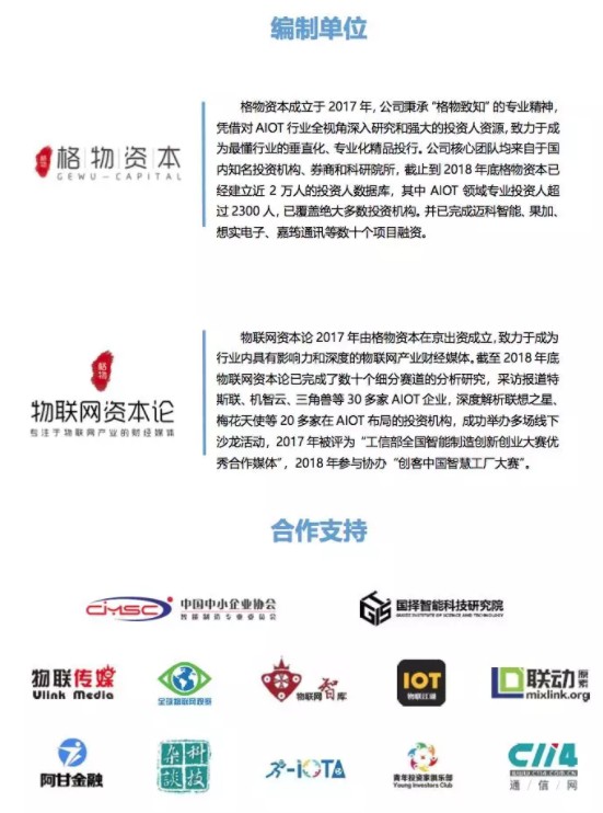 在过去的2018年格物资本也一直在深挖AIOT领域的优秀项目和投资机会,完成了数十个细分赛道的分析研究,帮助十余家企业获得融资,旗下的物联网资本论采访企业30+,深度分析AIOT布局的投资机构15+,举办多次沙龙活动并协办“创客中国智慧工厂大赛”。而在这一年中我们也发现阿里、腾讯、小米等企业把AIOT上升到战略层面高度,越来越多的投资机构开始对AIOT领域布局。
