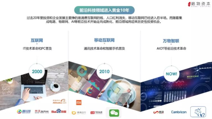 回看过去20年我们认为可以把整个投资主趋势划分为2个阶段:第一个阶段是互联网1.0阶段(PC时代),1999年前后随着IT技术的进步带动了PC的普及,在这个阶段,依托PC的高增长,也诞生了像BAT这类初代互联网公司;第二个阶段是互联网2.0阶段(移动互联网时代),2010年前后随着通讯技术的发展和智能手机的普及,一大批像美团点评、今日头条、滴滴出行这样的移动互联网独角兽诞生。而现阶段我们可以看到:一方面,整个移动互联网已经进入后半场,聊天用微信,打车用滴滴,叫外卖用美团或饿了么,基本上大的方向上已经山头林立很难再有新的颠覆式的创业或者投资机会;而另一方面,半导体、光电、5G、AI等多技术的进步和融合,正在对不同产业进行重塑和影响,很像互联网和移动互联网爆发前夕“山雨欲来风满楼”。回溯历史可以发现,每一次互联网产业升级都是技术先行,而这一次AIOT等多技术融也将吹响互联网3.0——万物智联时代的号角。