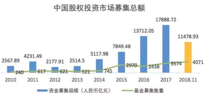对于创投行业而言,2018年是一个复杂的年份。一方面,2018年的VC/PE市场,是数年来首个没有风口的年份,2014-2015年的O2O、互联网金融,2016年-2017年的直播、共享经济,持续数年的狂欢到了18年显得特别的“清淡”。另一方面,“史上最严资管新规”和二级市场的惨淡也导致创投机构“断粮”,根据清科研究数据显示,2018年前11月中国股权投资市场共募集金额接近1.15万亿,同比下降了28.7%。
