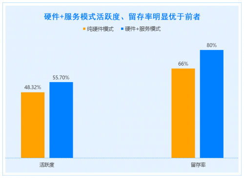 从下面的柱状图中,运营商在两种模式下的收入及该企业的用户活跃度和留存率差距会有更明显的体现: