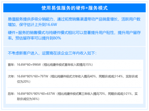 企业通过易值服务实现分润分销,物联卡运营,拓宽了销售渠道,提升了企业的运营收益;三年内运营商的流量费收入也逐年增加,总流量费收入提高34%。在不计算新用户的情况下用户活跃度增长约7%,留存率也提高了14%,效果立竿见影,企业和运营商实现双赢。
