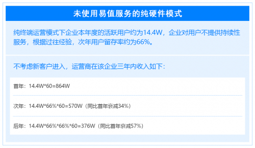 以某硬件生产销售企业(以下简称企业)为例,我们将该企业今年的数据结合往年的发展规律来进行预测分析。已知企业开卡数约29.8W,一台终端(内含一张物联卡)每年支付给运营商60元(按目录价)。