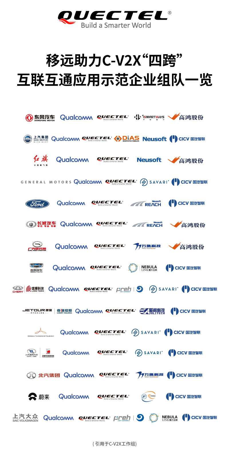 此次与移远合作参与C-V2X“四跨”展示的企业包括长城汽车、上汽、一汽红旗、福特、上汽大众、通用汽车、北京汽车、广汽、东风、吉利、吉利商用、雷诺日产三菱联盟、奇瑞和雄狮科技、奇瑞商用车、蔚来共15家整车企业,以及大连东软、联创汽电、东软睿驰、延锋伟世通汽车电子、均胜电子、星云互联、Savari、华砺智行、聚利科技、万集科技等超过10家Tier 1供应商。