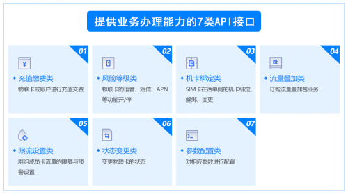 目前,OneLink物联卡能力开放平台提供业务办理能力的7类API接口。