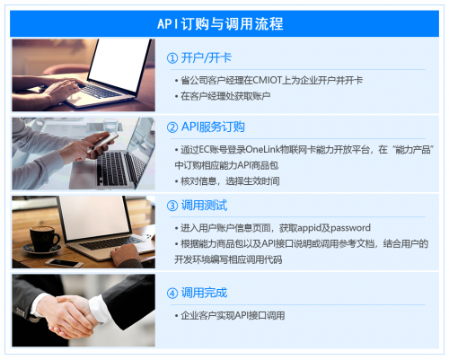 途径一:线上申请,用户可在OneLink物联卡能力开放平台上订购业务办理能力相关商品包,订购成功后就表示已成功申请API。