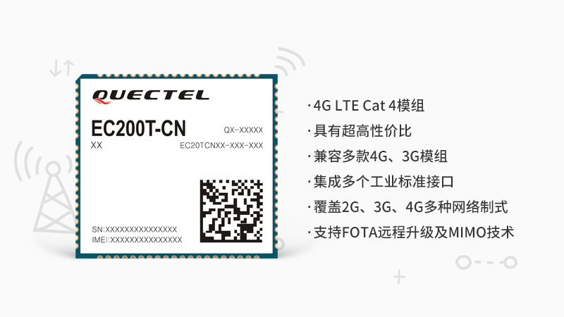 移远Cat 4模组EC200T基于国产平台研发,拥有超高的性价比。其支持最大下行速率150Mbps和上行速率50Mbps,支持FOTA远程升级功能及MIMO技术。该模组可兼容移远LTE EC2X系列及UMTS/HSPA+模组UC200T等,还可支持标准的 Mini PCIe 封装。