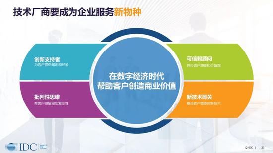 IDC提出,如何在疫后加速获取未来企业在数字化转型过程中的新商机,就要求技术厂商将自身企业打造成企业服务新物种,从而在数字经济时代帮助客户创造商业价值。首先,技术厂商要成为行业用户的创新支持者,为客户提供知识和经验;其次,要成为企业可信赖的顾问,符合客户愿意和价值观;第三,很重要的一点是要有批判性思维,帮助客户理解现实的复杂性,在创新过程中共同进步;最后,需要有新技术网关来整合客户所需要的技术,从而提供一套完整的解决方案。