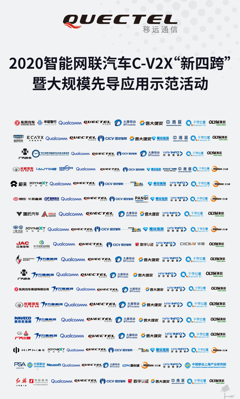 本次,移远与红旗、丰田、本田、东风汽车、吉利汽车、广汽蔚来、长城汽车、蔚来、华人运通、斯威汽车、哪吒汽车、一汽大众、江淮汽车、宝沃汽车、东风汽车集团有限公司、南京依维柯、广汽三菱、PSA等18家整车企业,以及华砺智行、亿咖通、万集科技、均联智行、海康智联、中汽院智能网联、飞驰镁物、中移物联、聚利科技、芯驰、Denso、广州中国科学院软件应用技术研究所、商泰等10多家供应商携手进行了本次C-V2X“新四跨”暨大规模先导应用示范活动。