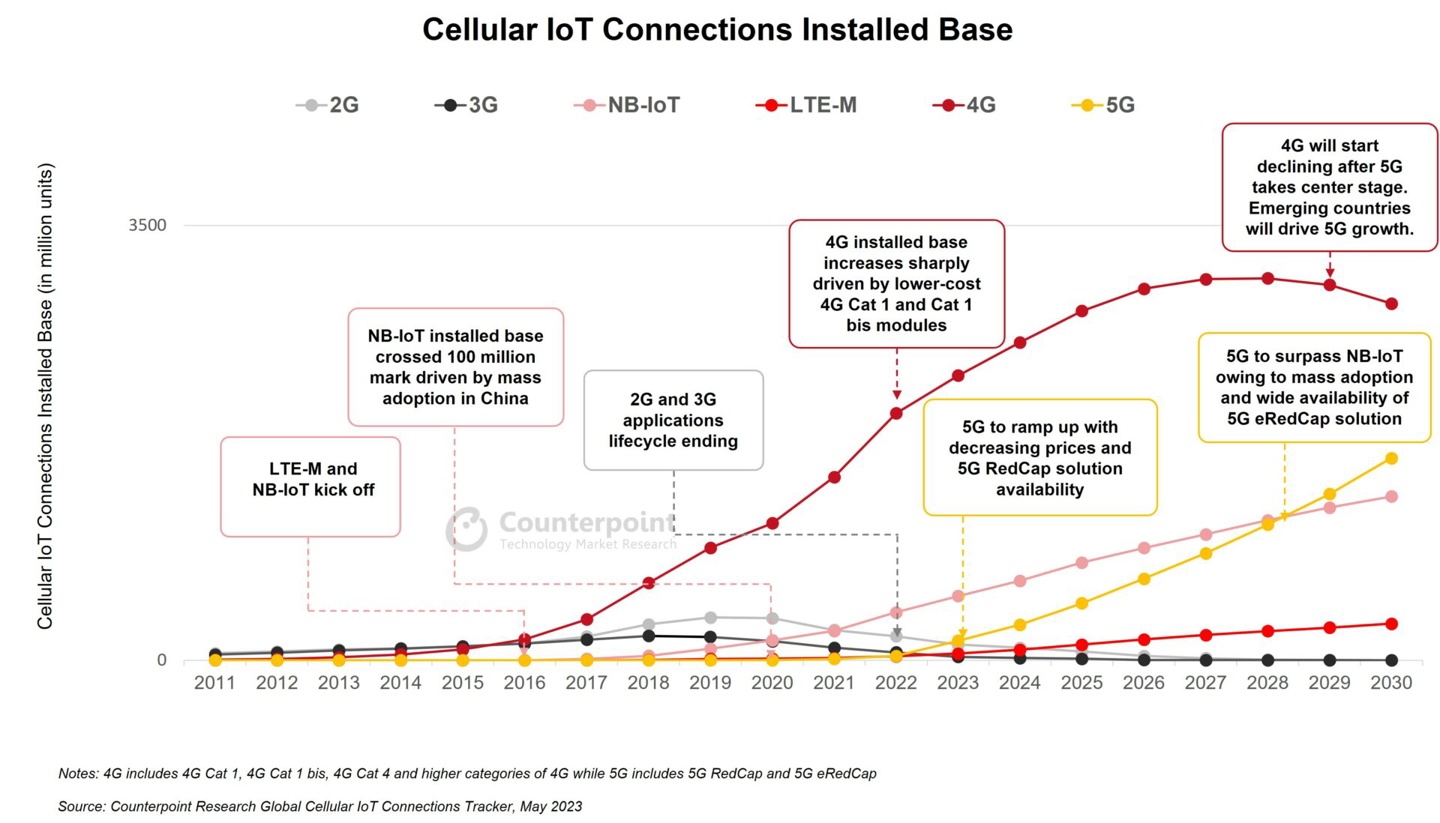 根据市场调查机构 Counterpoint Research 公布的最新报告,2022 年全球具备蜂窝网络连接的物联网设备达到 27 亿台,同比增长 29%。