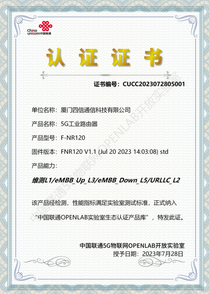 目前,四信5G 工业路由器已进入“中国联通OPENLAB实验室生态认证产品库”,后续将推动在全国重点项目中形成示范应用。