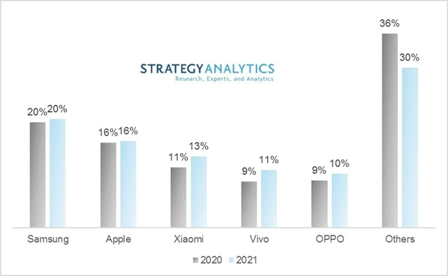 Strategy Analytics最新发布的研究报告指出, 2021年,全球智能手机出货量将同比反弹6.5%,达到13.8亿部。分析师预测,2021年小米将超越华为,成为全球第三大智能手机厂商。