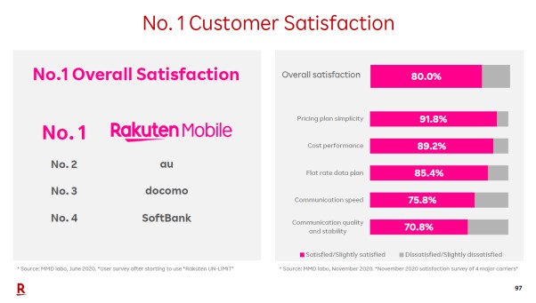 尽管Rakuten Mobile在网络虚拟化方面的创新屡获殊荣,但它尚未证明自己能够在网络性能上打败竞争对手。Rakuten Mobile CTO Tareq Amin在其2020年第三季度业绩中强调,Rakuten在11月的客户满意度调查中位居榜首。这一结果是由Rakuten的服务价格推动的,37%的受访者将价格作为主要衡量标准。Rakuten宣称其4G服务的价格是同类4G服务的50%或更低,并且在Rakuten宣布“Zero Declaration”之后,4G和5G现在对新用户第一年免费。在这次调查中,Rakuten的最差得分是网络质量,只有75.8%的消费者对通信速度感到满意,70.8%的消费者对通信质量和稳定性感到满意。总的来说,调查中Rakuten在通讯质量方面的排名最后。