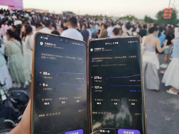 在演唱会场景,通过宏微D-MIMO叠加MM多流增强、5G-A等创新技术,为用户提供了差异化的网络体验服务能力。保障用户上行速率体验提升32%,微信图片及视频发送时延压缩至6秒以内,下行速率体验提升26%,高清视频即开即播。