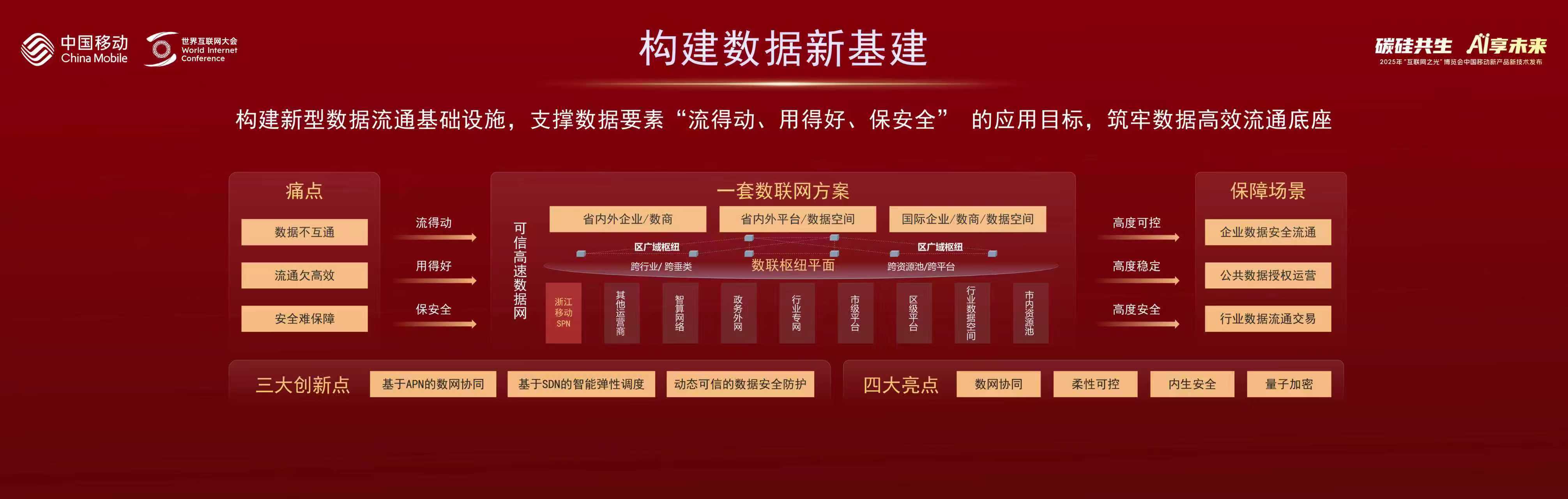 中国移动已率先建成全国首个跨省数联网枢纽,于今年9月底实现杭州、温州、天津等多地互联,具备跨域节点毫秒级握手与TB级可信数据传输能力。基于上述新型数据基础设施,浙江移动创新推出“一站式确定性数联服务“新范式,实现“入网即合规、网内即安全”,推动数据流通服务从传统网络连接向以安全与合规为默认属性的新模式演进,使用户更专注于数据价值挖掘,无需担忧网络连接风险。