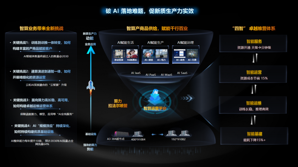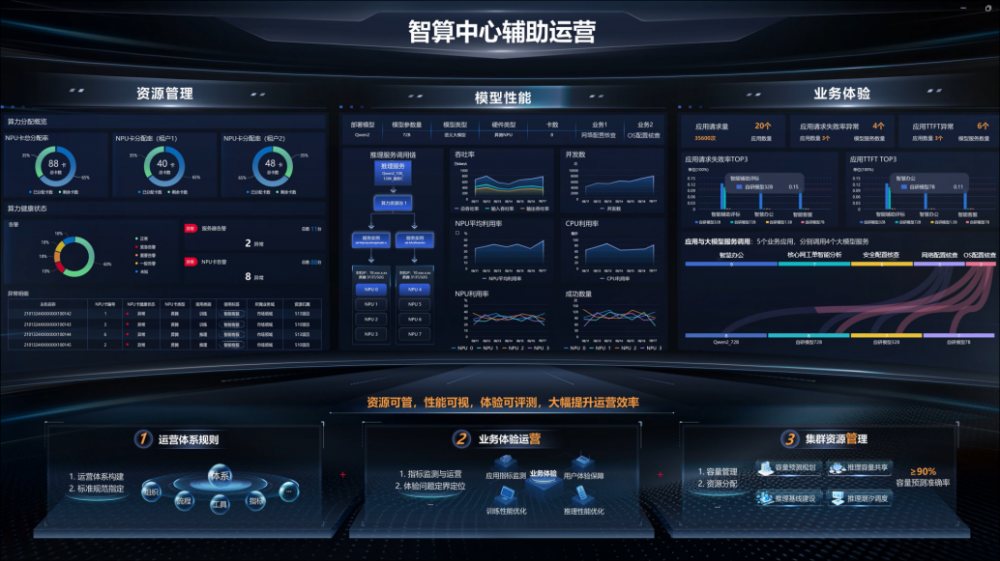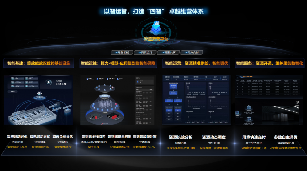 浙江移动网管中心携手华为倾力打造云智算“四智”维营体系,以智算运营平台为核心,围绕“智能基建、智能运维、智能运营、智能服务”四个方面开展体系能力建设,为客户提供“绿色节能、高质运行、普惠共享、高效交付”的智算服务。