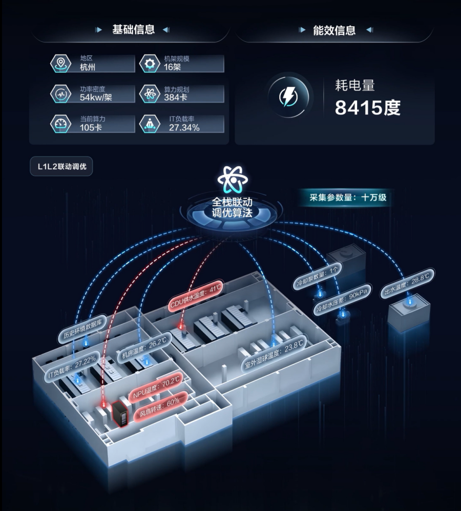 算液联动寻优:实时分析智算集群系统功率和室外环境变化,精准寻找最优制冷工况点,智能调节冷塔风扇频率、水泵工作频率、阀门开度等参数,降低液冷系统功耗,为 AI持续训推场景提供恒温、低耗的运行环境。