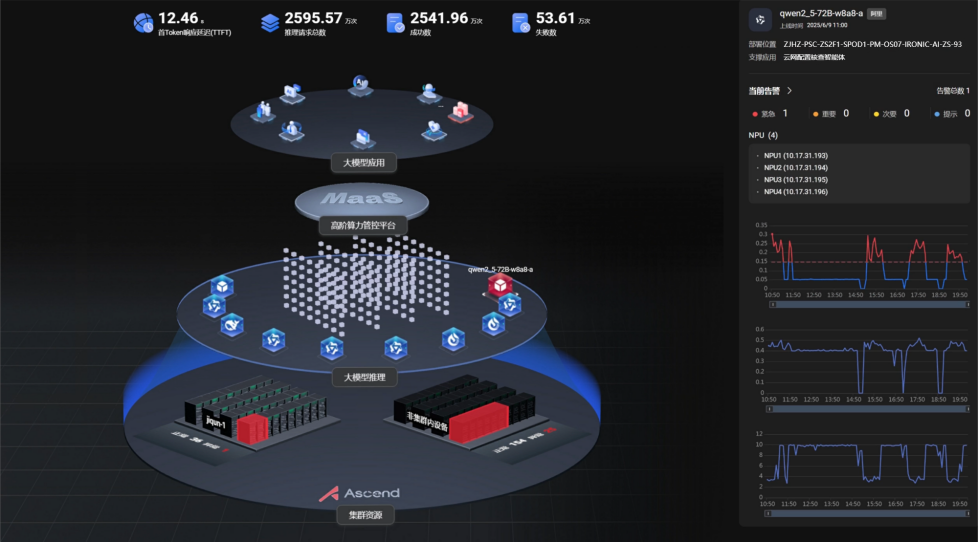 端到端故障处置:构建跨层“应用/平台/模型/算力”的立体排障能力,提供如切换节点、重置参数、调整分配等多样化修复手段,对智算业务故障进行快速抢通,实现智算业务可用度99.9%+,最大限度减少故障对训推任务的影响。