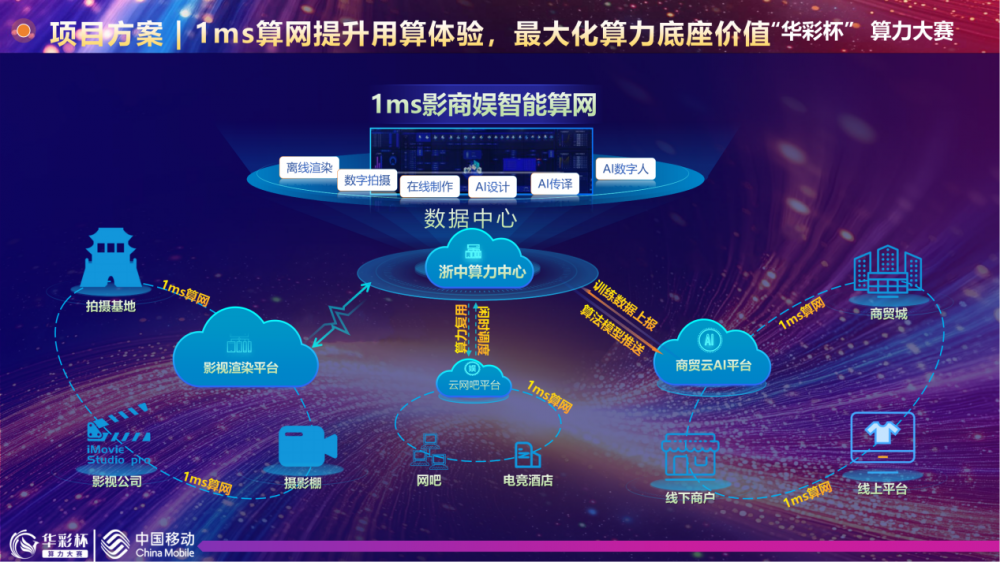 该项目积极响应工信部《毫秒用算专项行动》,依托中国移动1ms城市算网,精准对接义乌小商品创意渲染与横店影视实时预演的算力需求。通过构建义乌-横店跨域智算平台,实现影、商、娱业务的算力资源统一调度与毫秒级响应,打造了“一点接入、即取即用”的算力服务新模式,为区域特色产业升级注入新动能。