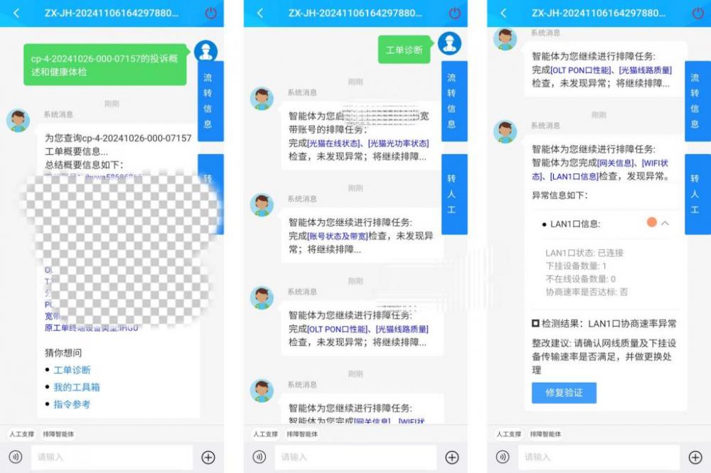 家宽装维作业智能体帮助实现基于故障场景的智能诊断、解决方案生成,并实现落单自动诊断、处理方案智能推荐、部分远程操作自动执行、工单报结智能校验