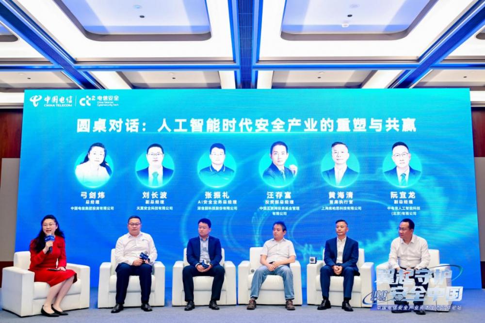 在圆桌对话环节,中国电信投资有限公司总经理弓剑炜主持、上海库帕思科技有限公司首席执行官黄海清、深信服科技股份有限公司 AI安全业务总经理张振礼、中国互联网投资基金管理有限公司投资部总经理汪存富、中电信人工智能科技有限公司副总经理阮宜龙、天翼安全科技有限公司副总经理刘长波围绕“AI时代安全产业的重塑与共赢”展开讨论,从技术、产业、资本等多维度,共同探讨AI时代下的安全趋势、挑战与合作路径。