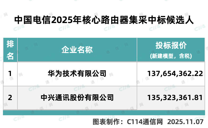 C114讯 11月7日消息(水易)来自中国电信阳光采购网消息,中国电信核心路由器设备(2025年)集中采购项目已完成评审,华为、中兴通讯入围。