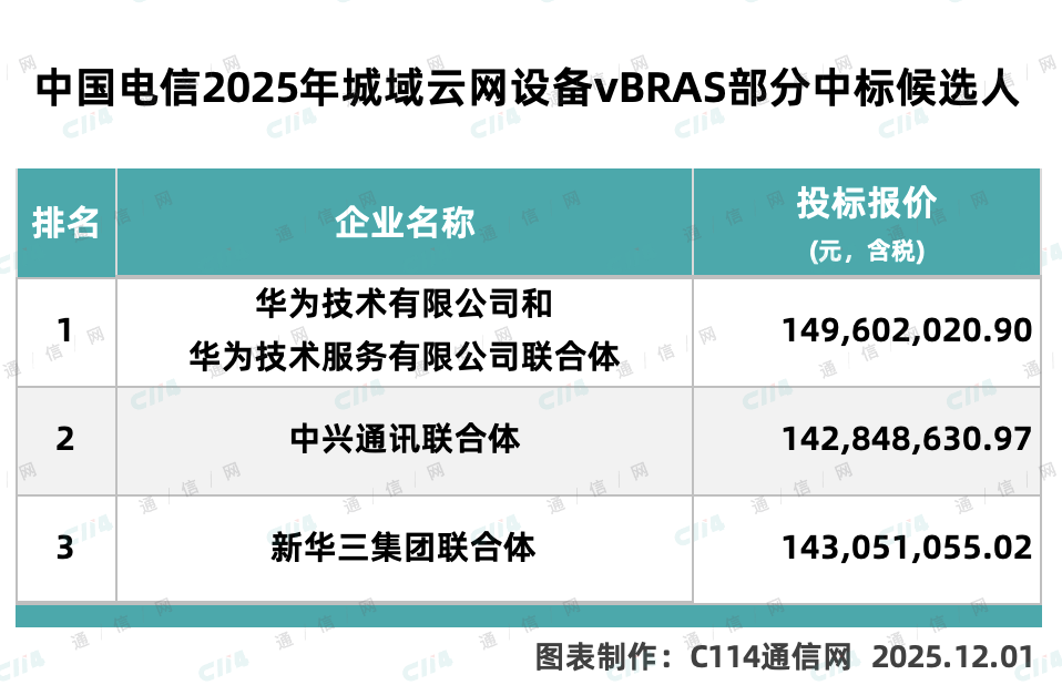 C114讯 12月1日消息(水易)来自中国电信阳光采购网消息,中国电信城域云网设备(2025 年)集中采购项目(vBRAS 部分)已完成评审。
