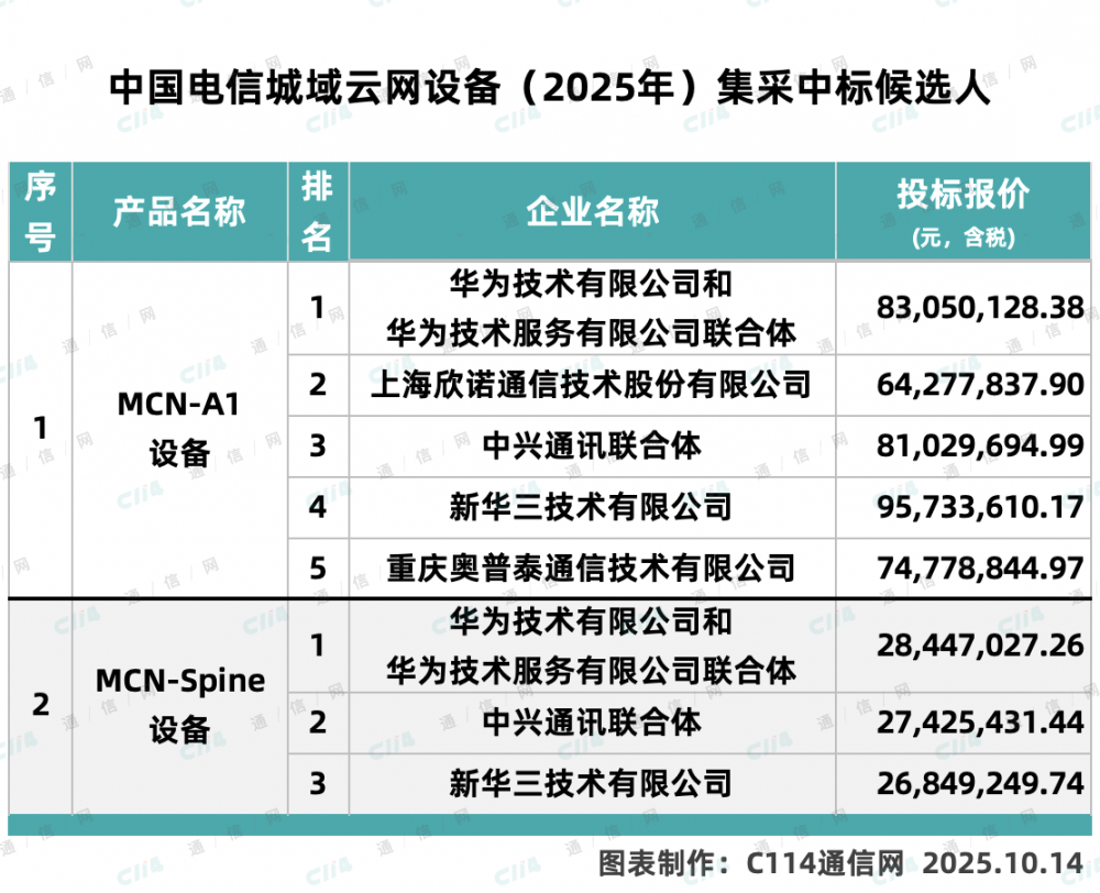 据了解,中国电信2025年城域云网设备集采共3个标包,包括MCN-A1标包和MCN-Spine标包和vBRAS标包。MCN-A1标包和MCN-Spine标包此前已公示中标结果。