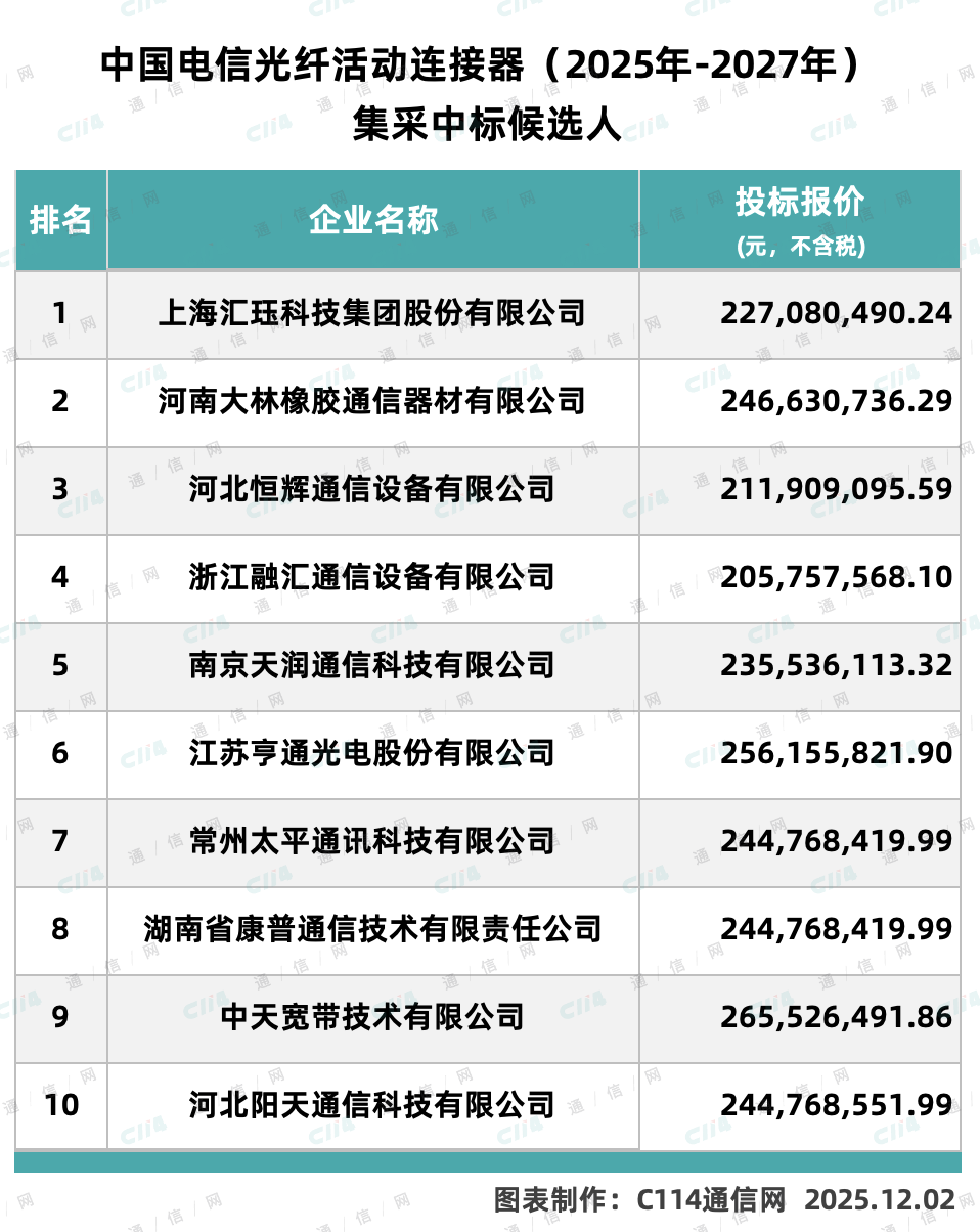 C114讯 12月2日消息(水易)来自中国电信阳光采购网消息,中国电信光纤活动连接器产品(2025年-2027年)集中采购项目完成评审,共10家厂商入围。