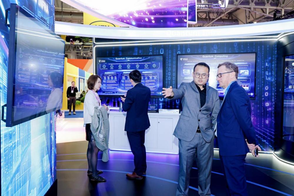量子基础设施展区,一座1:1全息投影的稀释制冷机以极具科技感的方式旋转,直观呈现超导量子计算机的核心运行环境——这正是搭载“祖冲之三号”同款芯片的天衍-287超导量子计算机的微观缩影。现场,许多首次接触量子计算的海外科研人员在投影前久久驻足,用手机记录这一“大国重器”的细节。