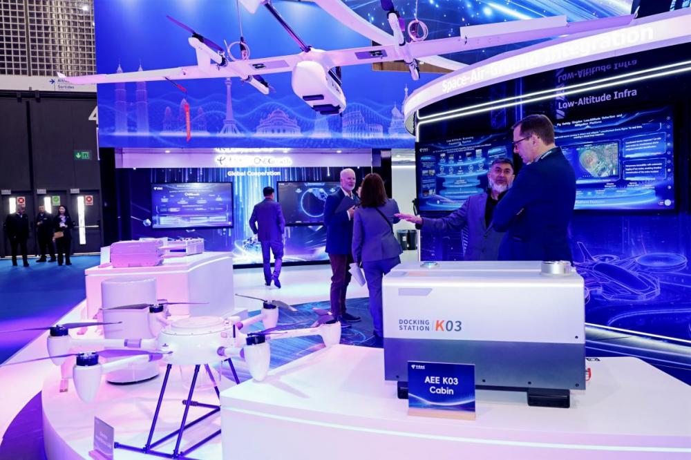 在低空基础设施板块,中国电信打造的“1+1+4+N”能力体系成为焦点:1个低空综合服务解决方案为底座,1张低空智联网融合通感算,星云、星盾、星巡、星瀚4大平台协同,为全球低空经济发展提供高效、安全的综合解决方案。“在内蒙古,星云低空作业平台在森林巡检项目中可实现单次飞行覆盖超300平方公里,山火巡检效率达人工8倍”,讲解员介绍道。目前中国电信低空应用已落地超1000个项目,并联合157家产业伙伴成立低空经济产业联盟,推动标准共建与生态繁荣。