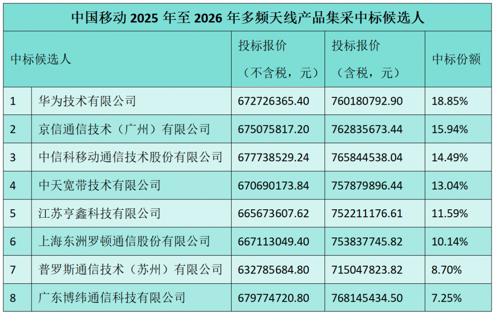 C114讯 8月18日消息(九九)中国移动采购与招标网日前发布2025年至2026年多频天线产品集中采购项目中标候选人公示,华为、京信通信等八家中标。