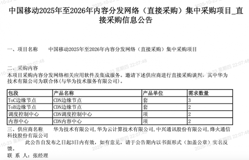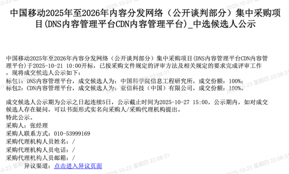 C114讯 10月24日消息(九九)中国移动采购与招标网日前发布2025年至2026年内容分发网络采购项目公告。