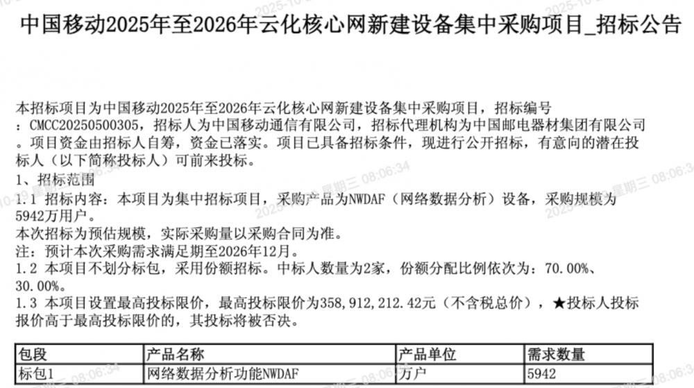 C114讯 10月29日消息(九九)中国移动采购与招标网昨日发布2025年至2026年云化核心网新建设备集中采购项目_招标公告,采购产品为NWDAF(网络数据分析)设备,采购规模为5942万用户。预计本次采购需求满足期至2026年12月。