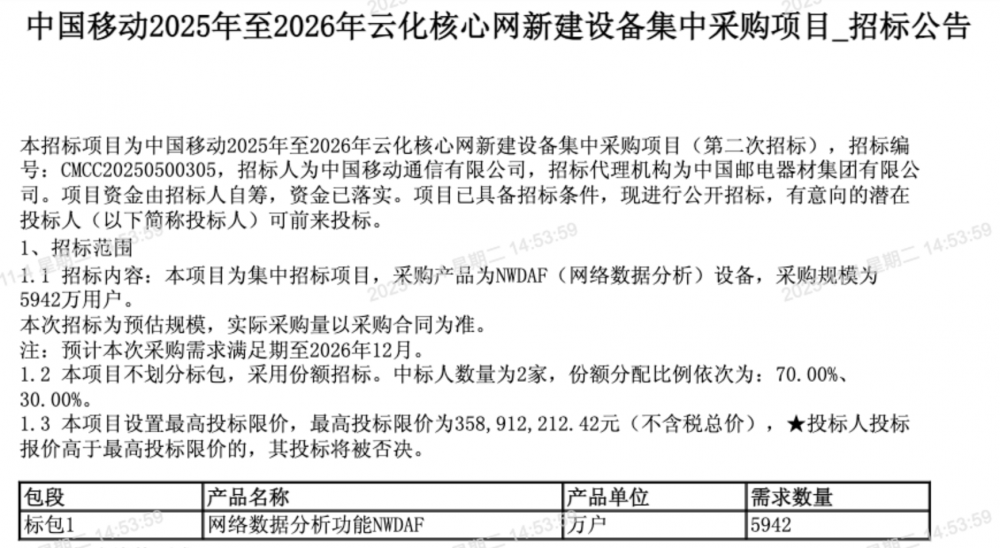 C114讯 11月4日消息(九九)中国移动采购与招标网日前发布2025年至2026年云化核心网新建设备集中采购项目招标公告,采购产品为NWDAF(网络数据分析)设备,采购规模为5942万用户。预计本次采购需求满足期至2026年12月。