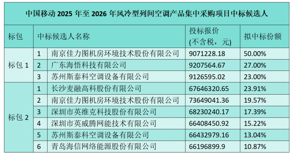 C114讯 11月10日消息(九九)中国移动采购与招标网日前发布2025年至2026年风冷型列间空调产品集中采购项目中标候选人公示,佳力图等七家中标。
