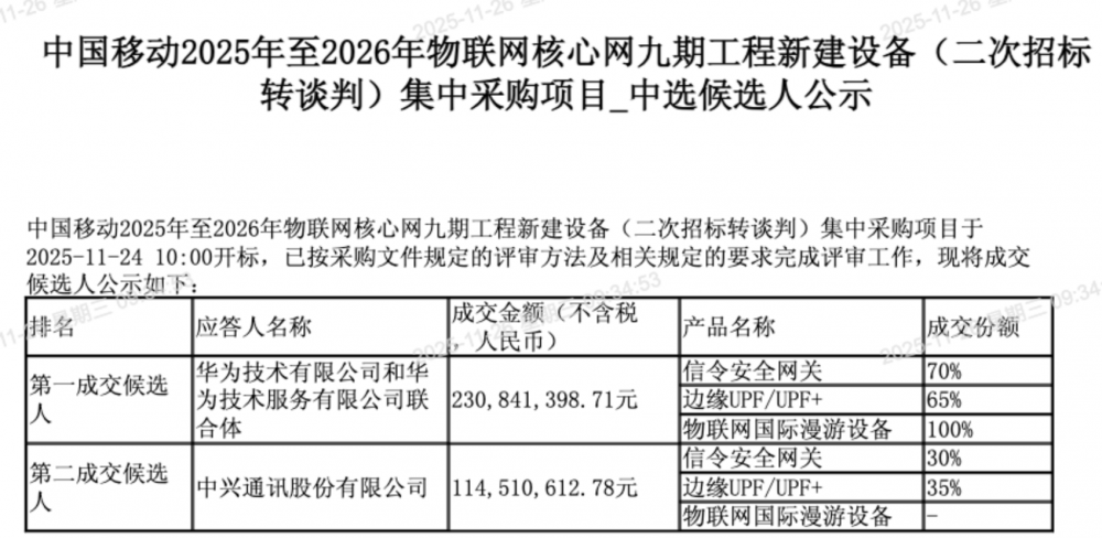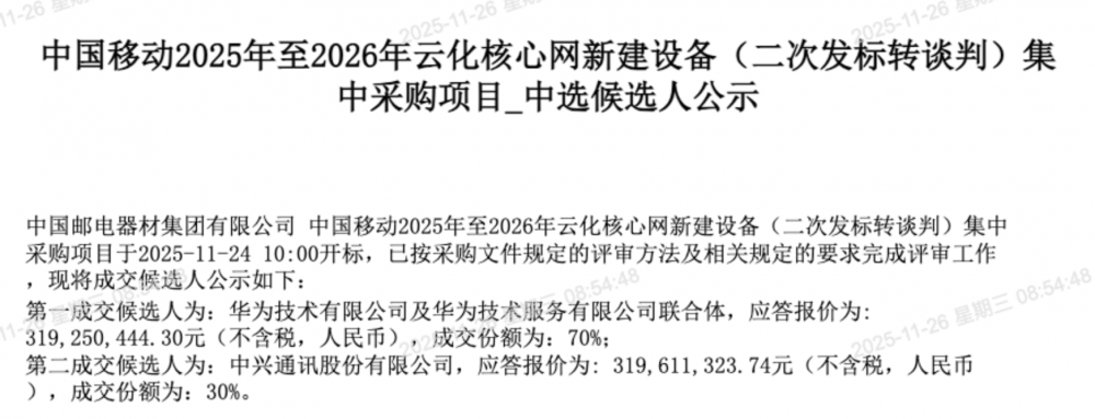 C114讯 11月26日消息(九九)中国移动采购与招标网日前发布两则核心网新建设备集采中选候选人公示:中国移动2025年至2026年物联网核心网九期工程新建设备及中国移动2025年至2026年云化核心网新建设备集采均为二次发标转谈判,中选候选人均为华为、中兴两家企业。