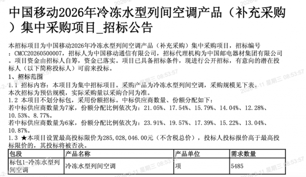 C114讯 2月11日消息(九九)中国移动采购与招标网日前发布2026年冷冻水型列间空调产品(补充采购)集中采购项目招标公告,采购产品为冷冻水型列间空调,采购规模为5485项。