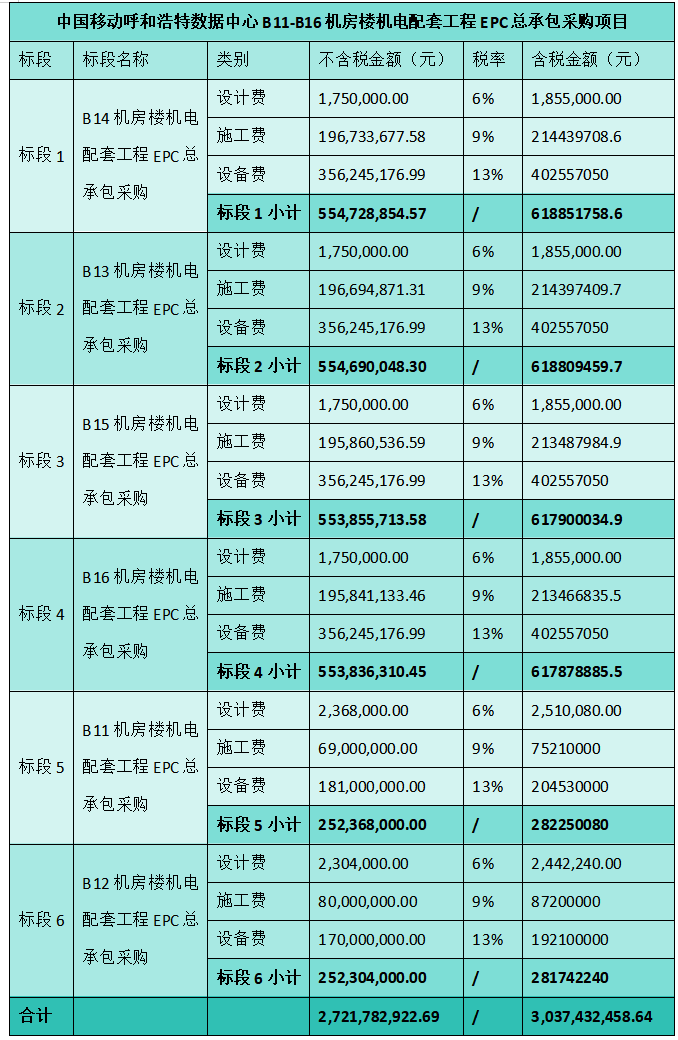 招标内容为中国移动呼和浩特数据中心B11-B16机房楼机电配套工程EPC总承包采购项目,共划分为6个标段,各标段项目内容概述如下: