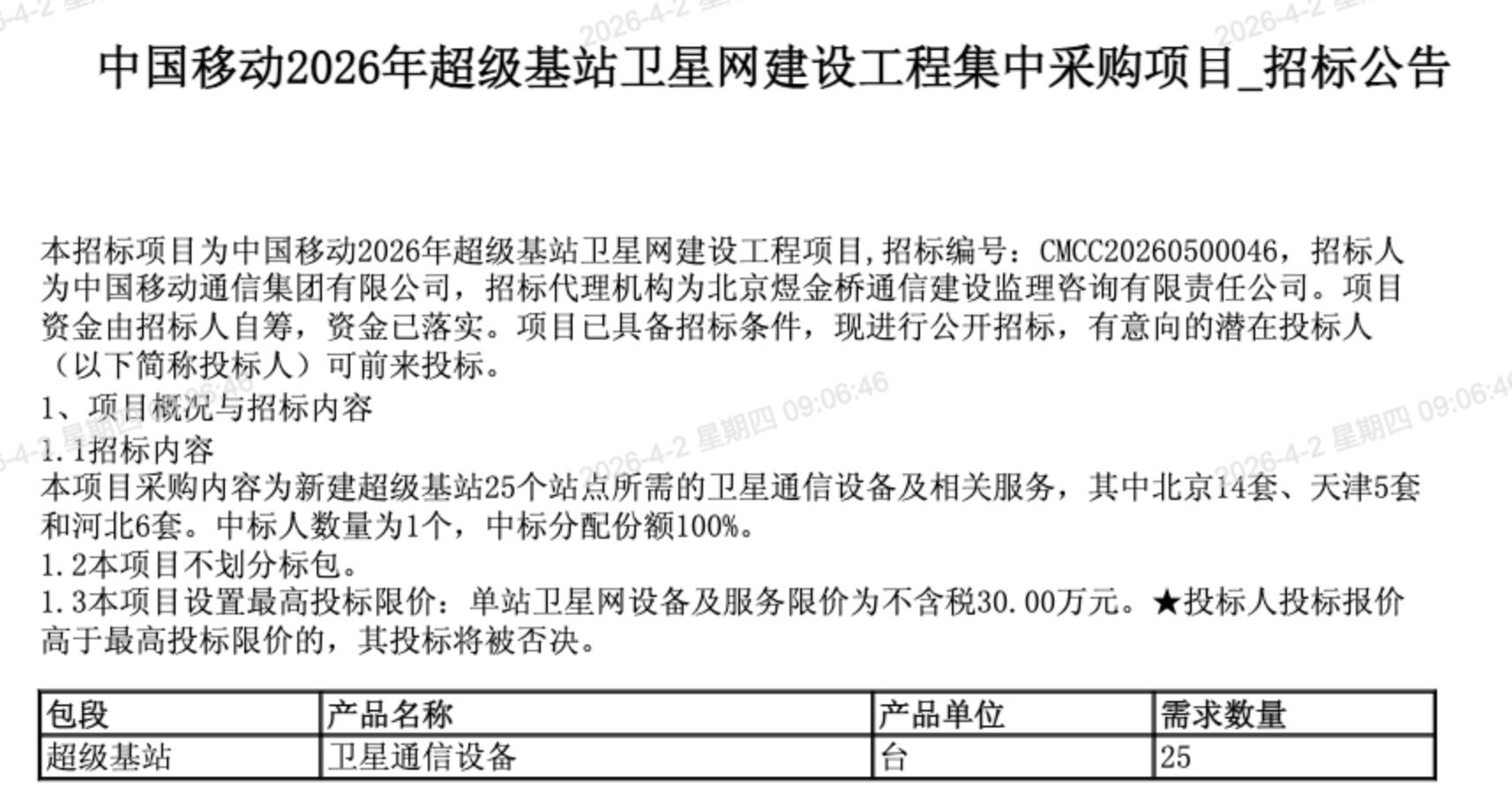 C114讯 4月2日消息(九九)中国移动采购与招标网日前发布2026年超级基站卫星网建设工程集中采购项目招标公告,采购内容为新建超级基站25个站点所需的卫星通信设备及相关服务,其中北京14套、天津5套和河北6套。中标人数量为1个,中标分配份额100%。