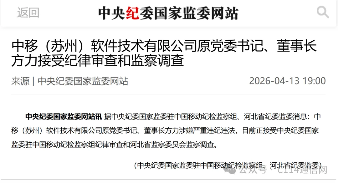 中移(苏州)软件技术有限公司原党委书记、董事长方力涉嫌严重违纪违法,目前正接受中央纪委国家监委驻中国移动纪检监察组纪律审查和河北省监察委员会监察调查。