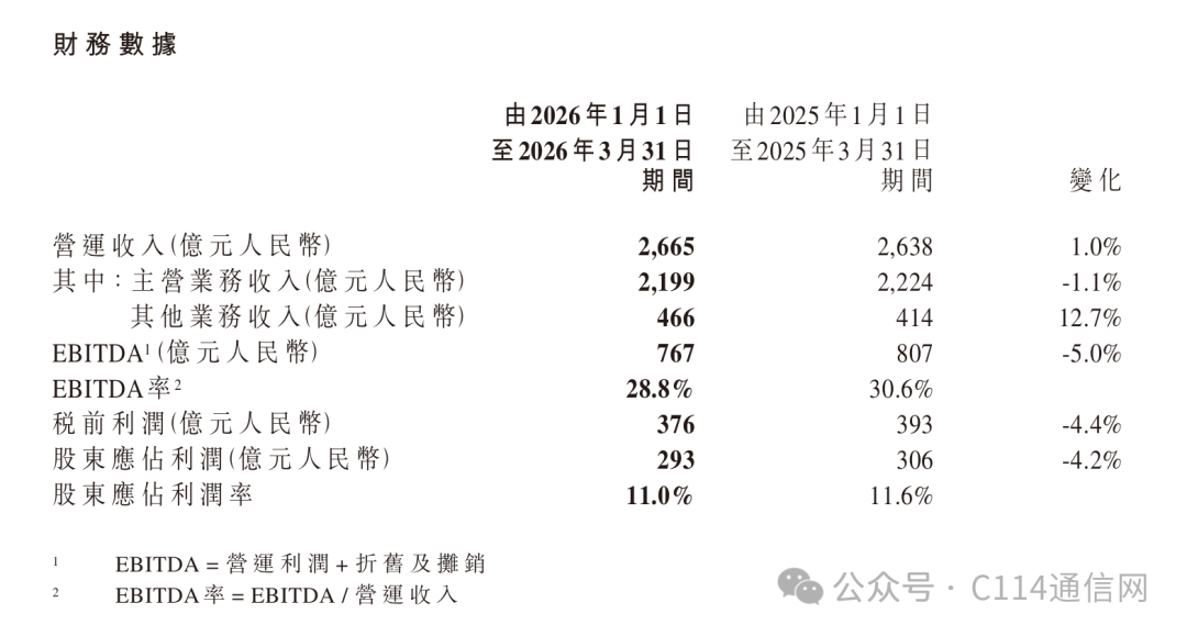 股东应占利润为293亿元,同比下降4.2%;EBITDA为767亿元,同比下降5.0%,EBITDA占主营业务收入比为34.9%。。
