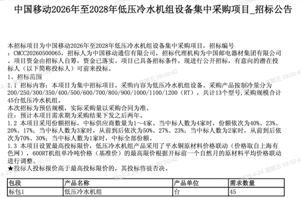 C114讯 4月24日消息(九九)中国移动采购与招标网日前发布2026年至2028年低压冷水机组设备集中采购项目招标公告。采购内容为低压冷水机组设备,采购产品按制冷量分为200/250/300/350/400/500/600/700/800/900/1000/1100/1200(RT),共计13个型号,采购规模合计45台。
