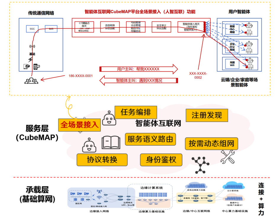 “电话号码即智能体接入点”方案的核心思想是打通传统电信业务网络与智能体互联网服务平台,支持为智能体分配一个专属电话号码,用户通过普通电话、短信即可与智能体互联互通,实现了通信入口的极大简化和泛在化。