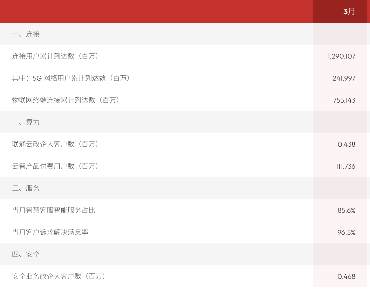连接业务方面,截至2026年3月,连接用户累计到达数12.90亿户;5G网络用户累计到达数2.42亿户;物联网终端连接累计到达数7.55亿户。