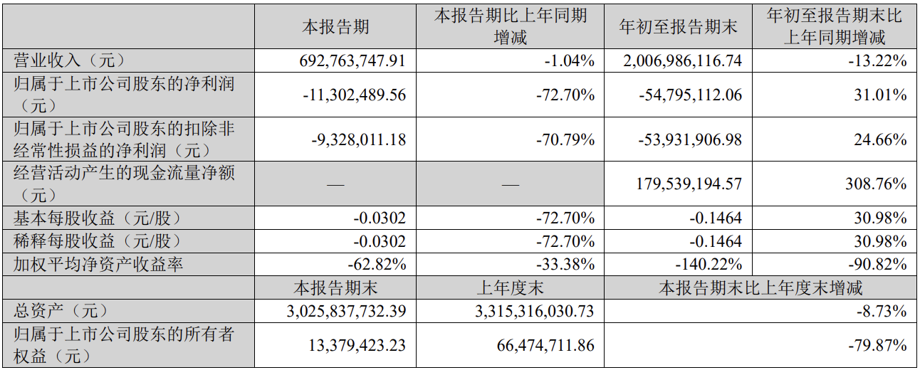 前三季度公司营业收入20.07亿元,同比下降13.22%;归属于上市公司股东的净利润为-5480万元,亏损额同比收窄31.01%。