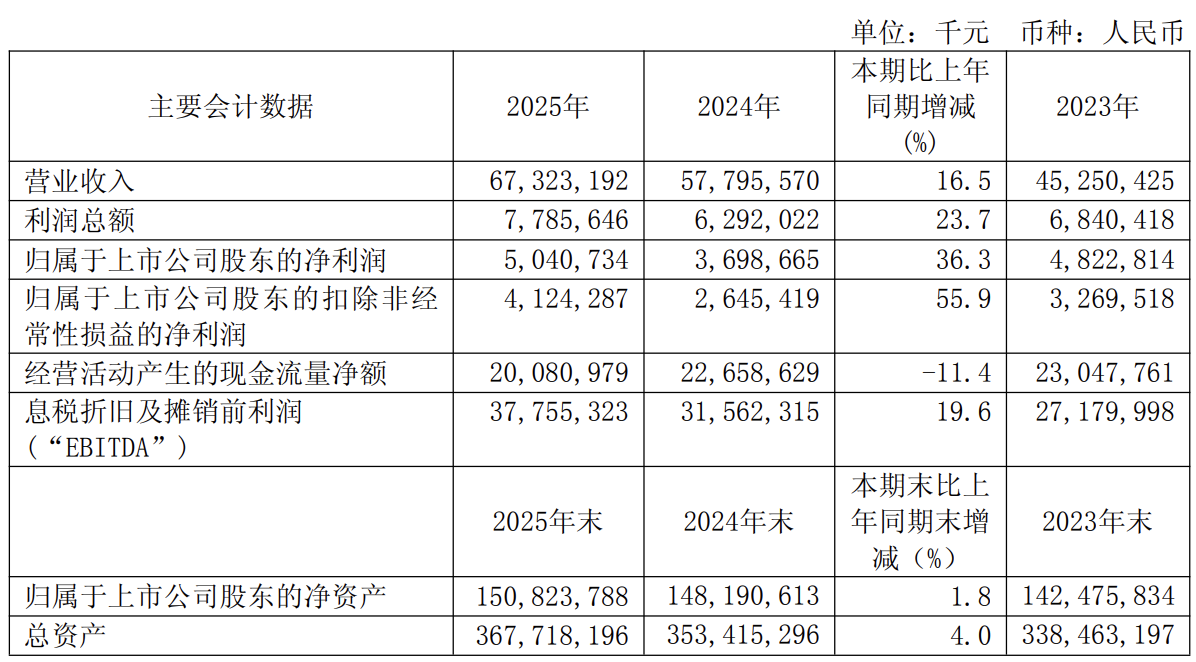 财务数据显示,截至2025年末,公司总资产达3,677.18亿元,同比增长4.0%;归属于上市公司股东的净资产1,508.24亿元,同比增长1.8%。基本每股收益0.63元,同比增长37.0%。