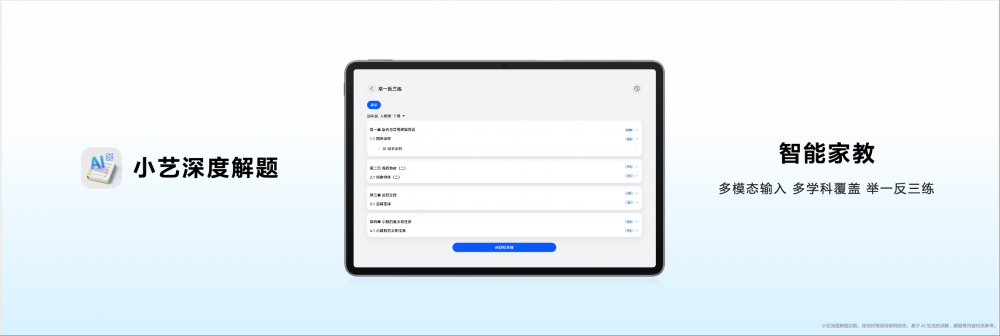 智慧学习方面,华为MatePad 11.5深度融合HarmonyOS,带来全新升级的小艺深度解题功能。它支持拍照解题,不仅提供清晰的步骤解析与多种解法,更能通过提问引导学生自主思考。该功能还可实现作业批改、AI互动讲解,并基于学习过程自动生成错题本,助力系统化的查漏补缺与巩固提升。