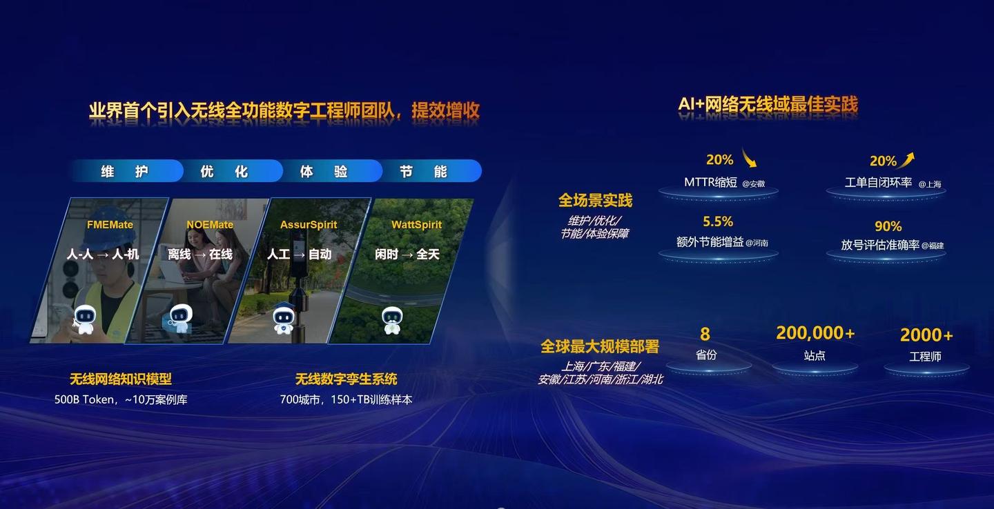 2025年,华为与中国移动联合创新,全球首个规模部署了无线网络智能体,并联合在上海、安徽、福建、广东、江苏、浙江、河南、湖北八省建成无线高阶自智网络示范区,实现AI+网络全面融入移动生产流程。目前,无线网络智能体已覆盖8省市20万站点、100 万小区,赋能超2000名网络工程师,完成40万5G站点智能化升级,在能力重塑、交互重塑、流程重塑三大方向取得标志性突破。