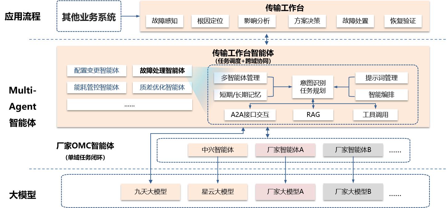 项目创新性地打造Multi-Agent多智能体协同框架,通过传输工作台智能体(负责任务调度、线路故障诊断)与厂家OMC智能体(operation and maintenance center,负责单域故障识别、诊断与修复)高效协同,实现“故障感知、根因定位、业务分析、方案决策、故障处置、恢复验证”端到端自动化,构建面向网络故障的“黑灯工厂”处理模式,彻底改变了以往依赖人工低效处理的局面。