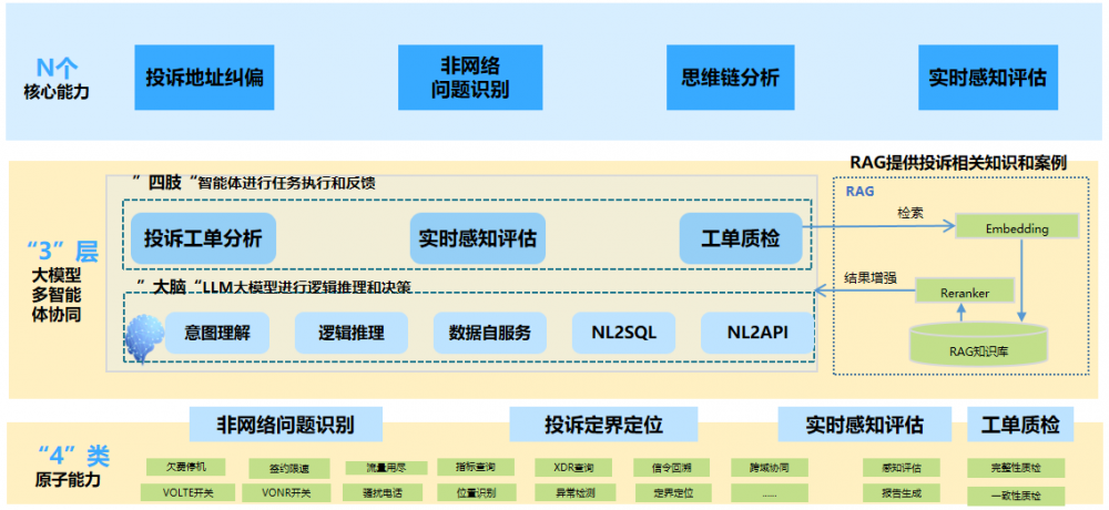 数字员工聚焦全流程优化,融合四大智能化能力:智能地址纠偏,可实时回填用户六级地址,提升派单准确率与处理效率;非网络问题自动识别,精准判断终端开关机、欠费、签约异常等问题,向前赋能客服,提升前端自解决能力;基于思维链的网络问题分析,依托通信大模型,实现对投诉内容的理解与推理;实时感知后评估,闭环验证处理效果,持续优化策略。